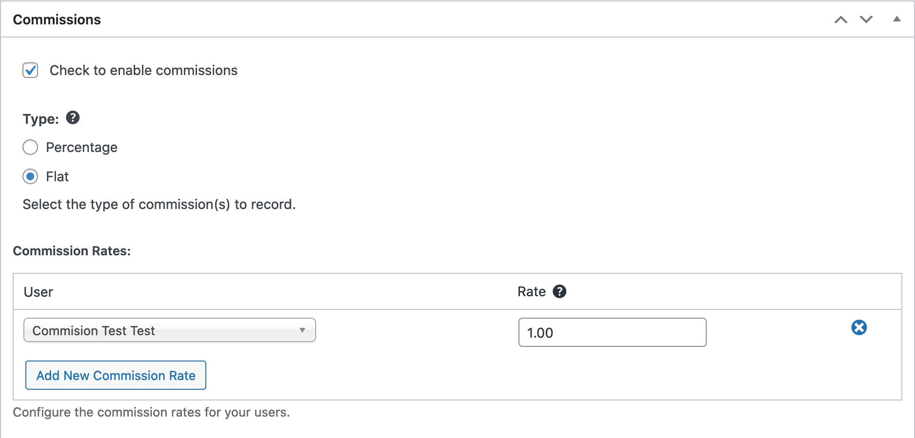 The commissions’ default rate applies to all commissions where the User Rate and Product rate are blank.