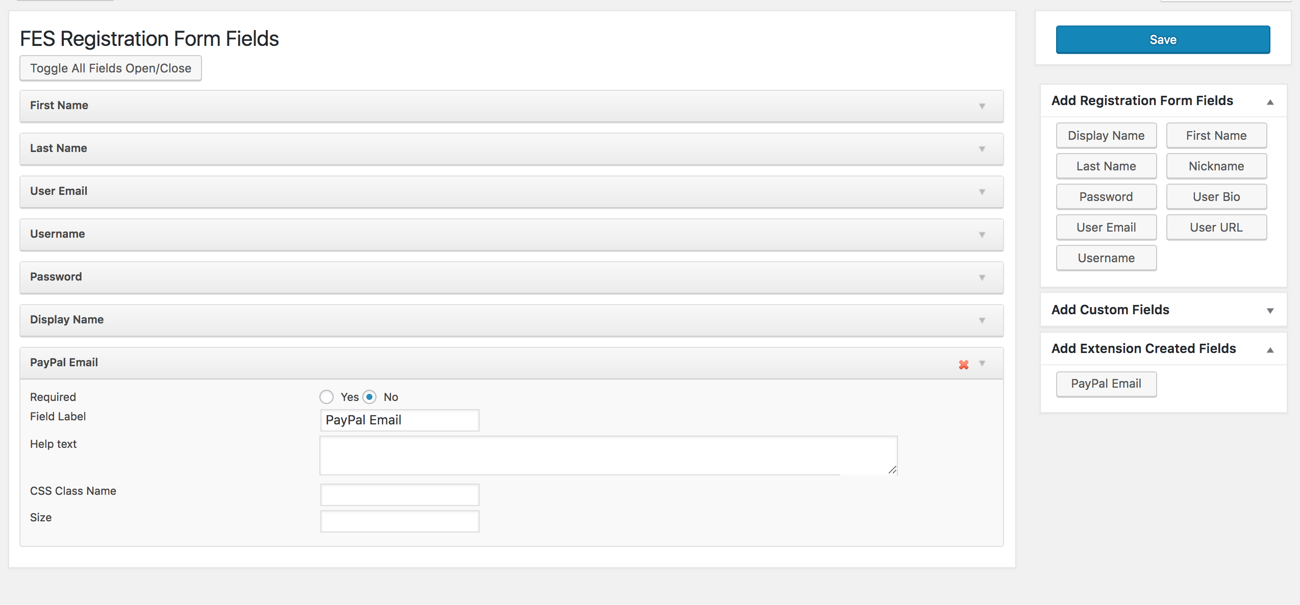 EDD FES → Registration Form → Add Extension Created Fields → Paypal Email