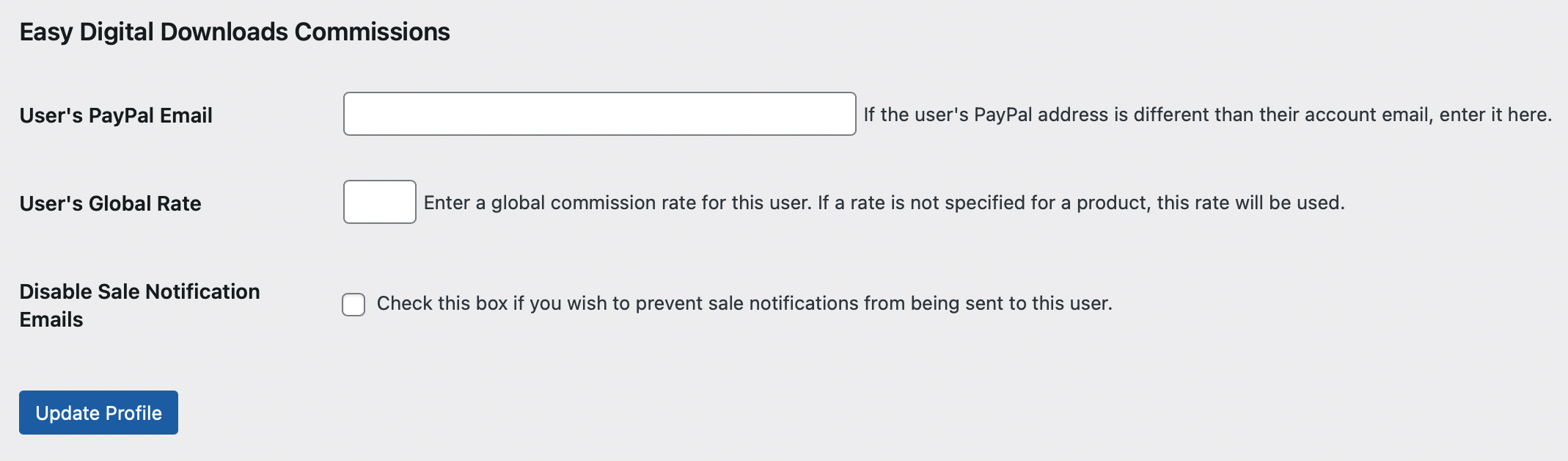 When your Vendors submit a new product for sale through Frontend Submissions, commissions will automatically be enabled for that product and the commission recipient will automatically be set to that Vendor. Their commission rate in the product itself will be left blank. This means that their commission rate will fall back to their User Rate, which you can configure for each Vendor by editing their user profile under: Users → User’s Global Rate