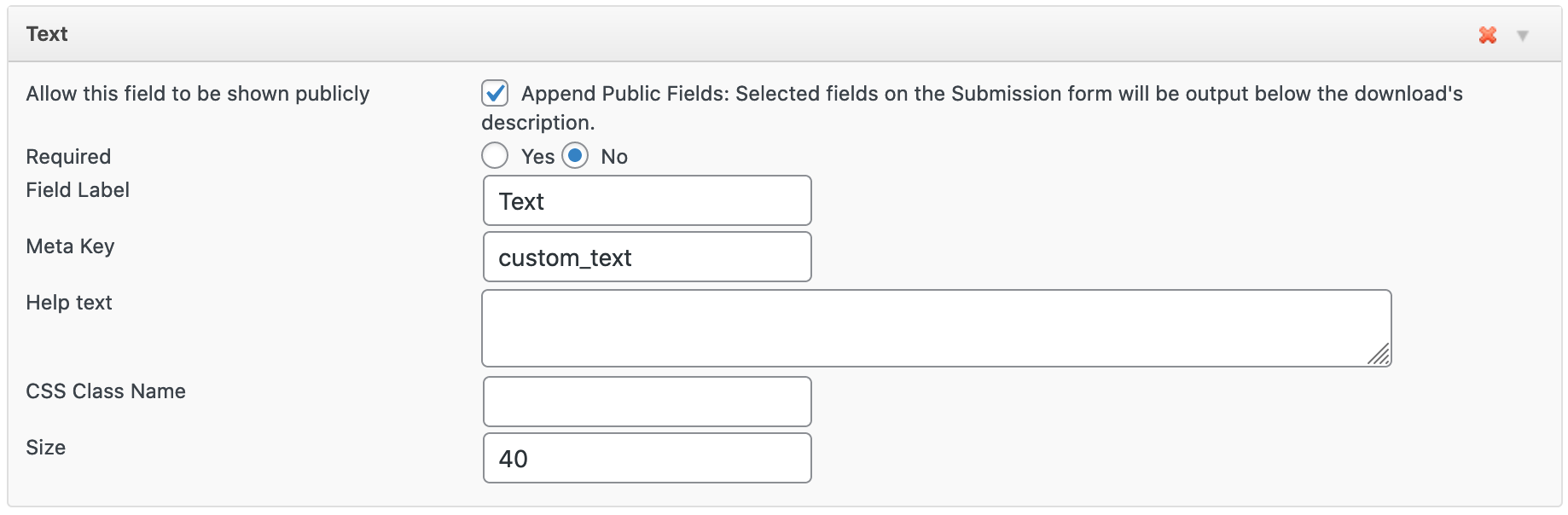 Below is an example of a plain text input field. Because this is a custom field the data will get saved in a meta table in WordPress, and therefore the Meta Key field is required.