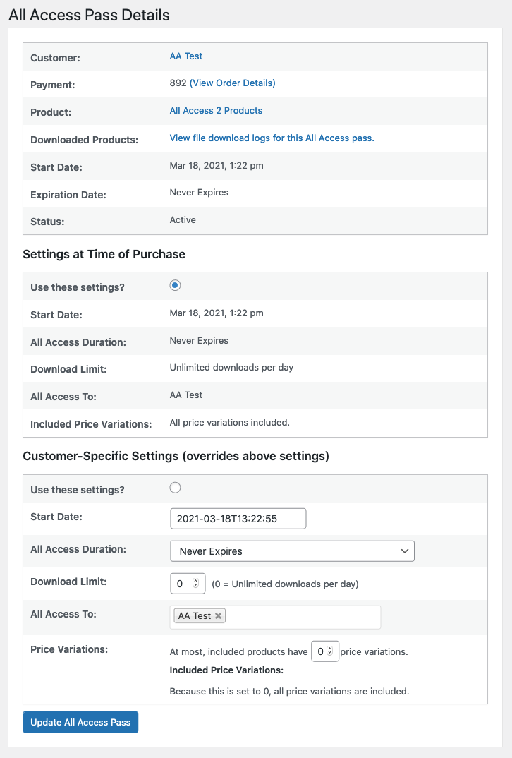 You can override the settings at the Time of Purchase by selecting to use the Customer Specific Settings instead. This allows you to set things like the download-limit differently for only this single customer. It’s important to note that if the customer renews their All Access Pass, the customer specific settings will remain and still be used for that customer.