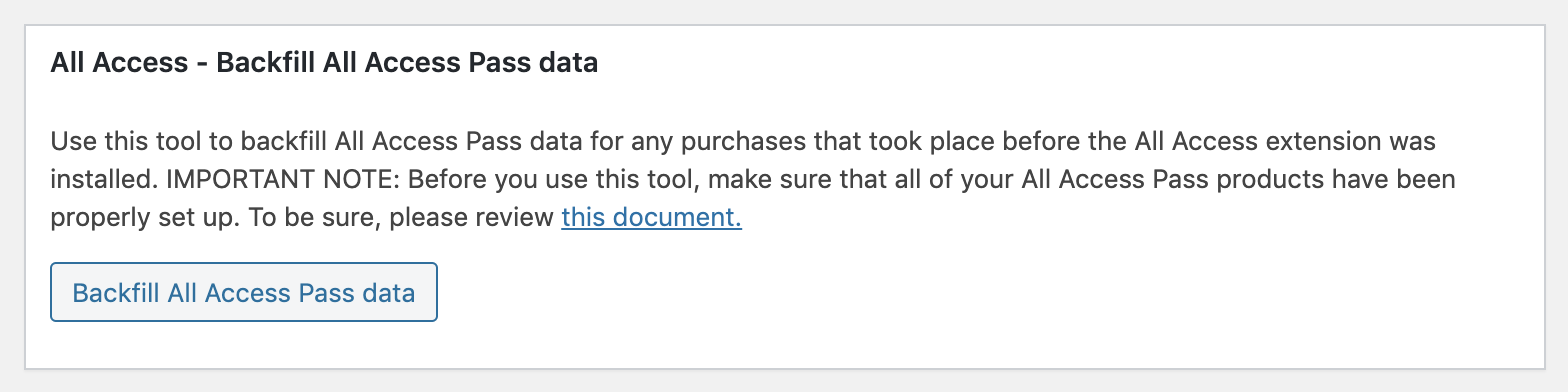 This tool can be found by navigating to Downloads → Tools. It is used to go through any old payments to see if any All Access Passes need to be activated for any payments that existed prior to the activation of EDD All Access. This is useful if you had some kind of pre-existing system for providing All Access and are now switching to use the EDD All Access extension.