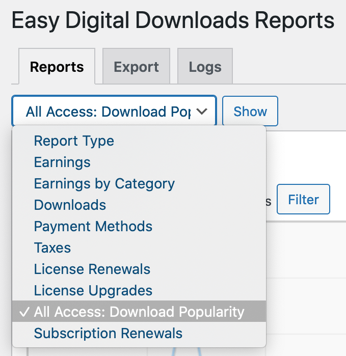 You can find the report in your WordPress dashboard by navigating to Downloads → Reports and choosing “All Access: Download Popularity” from the dropdown selection.