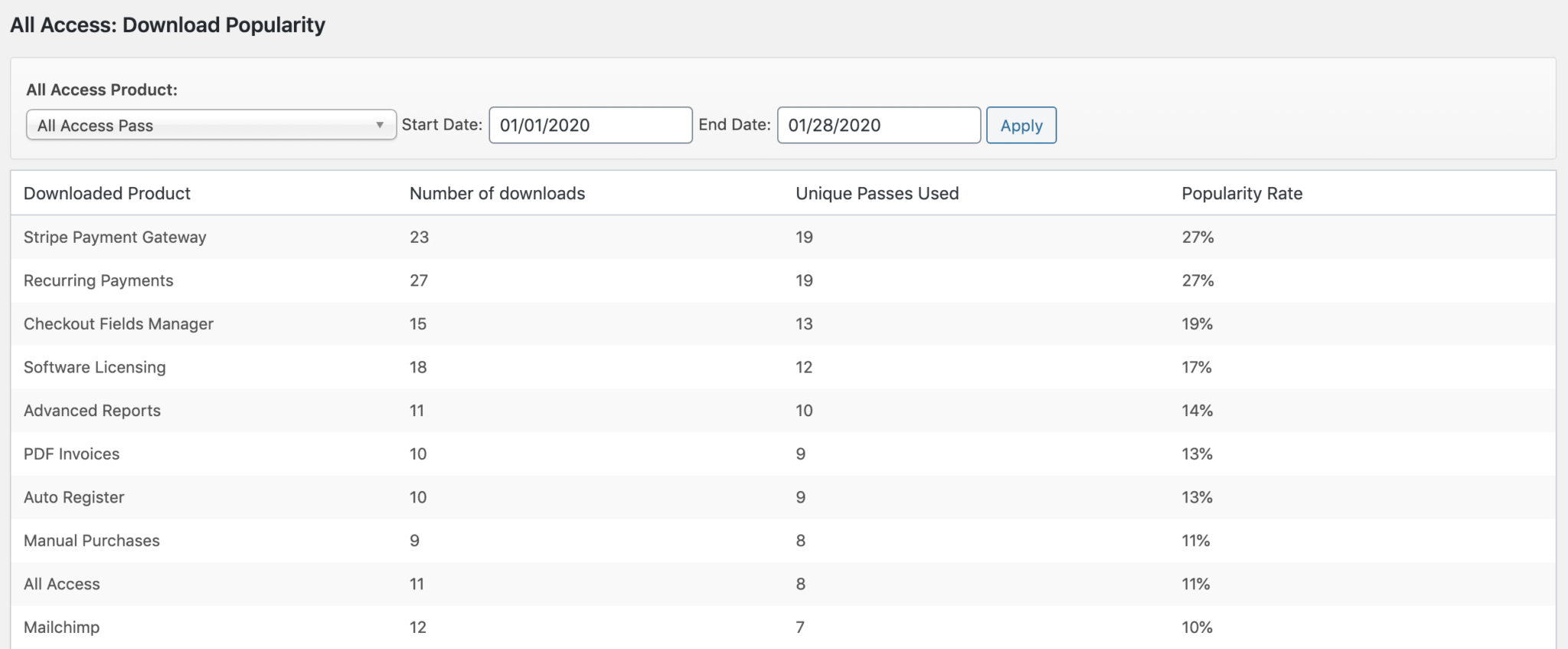 Starting in version 1.1.3 of EDD All Access, you can view a report of your most popular products, as downloaded by your All Access Pass holding customers.