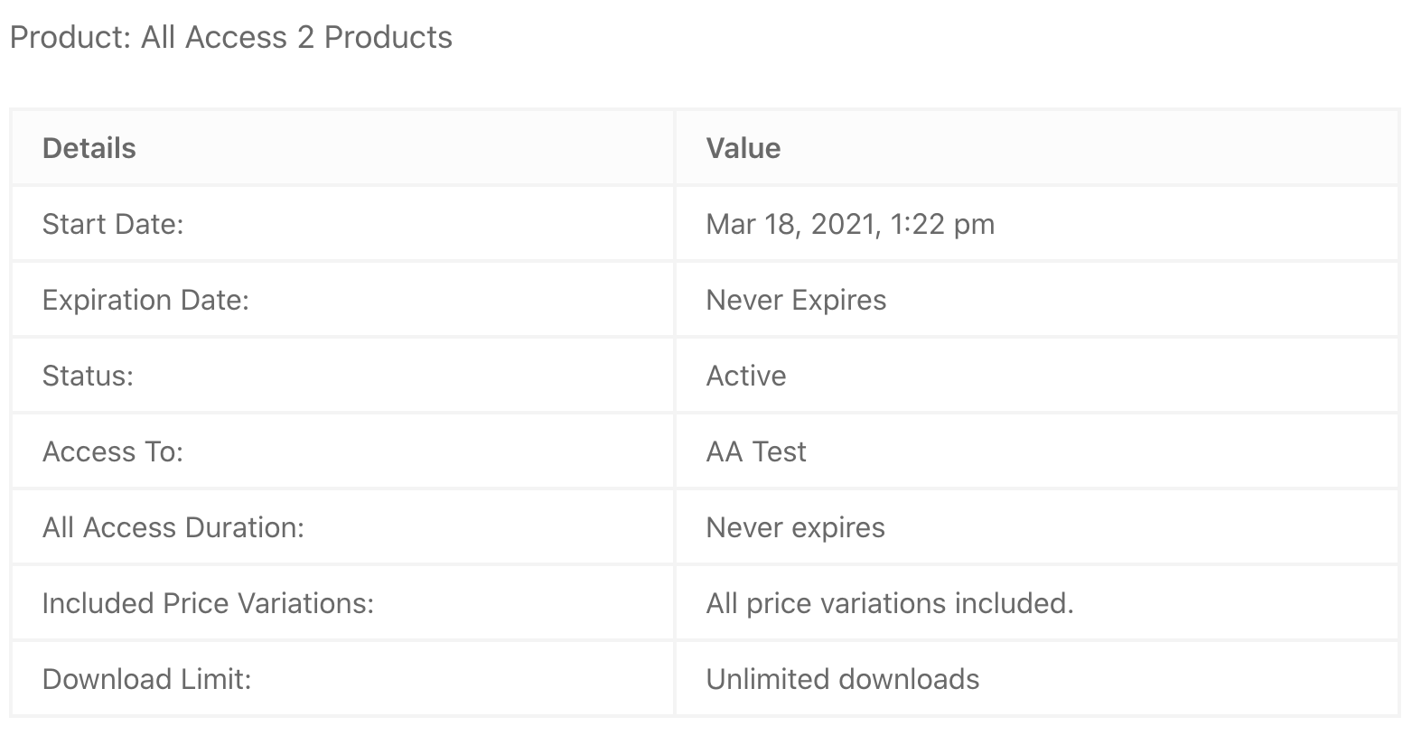 This shortcode will output a list of the customer’s All Access Passes along with all of the relevant details. We recommend putting it on their Customer account page.