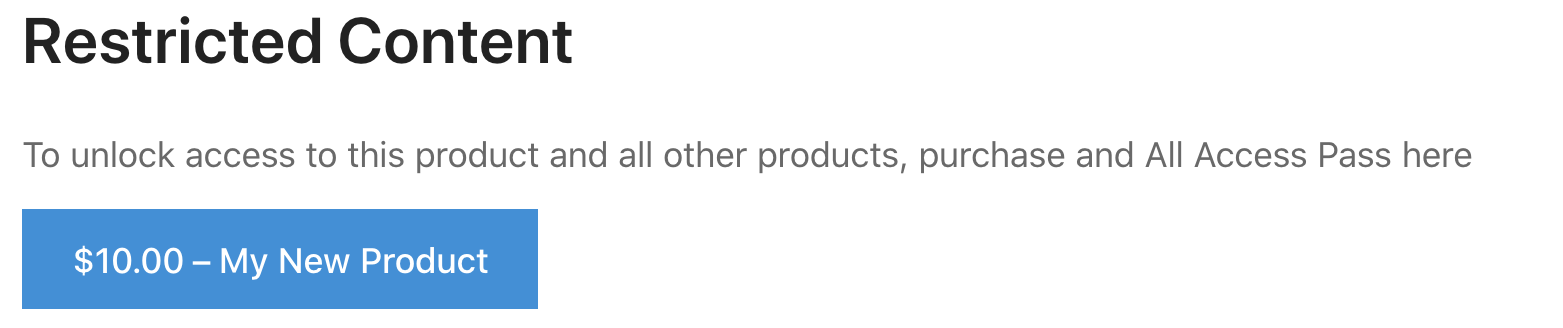 - success_text – The message shown to a user before they are redirected when successfully logged in and purchased. By default this is “You have an All Access Pass for Product X”.
