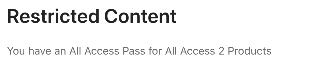 Instead of using success_text, you can also show success content. This is perfect for single pages where you want to restrict exclusive content to All Access Pass holders. To show exclusive, restricted content to All Access Pass Holders, use the shortcode like this: