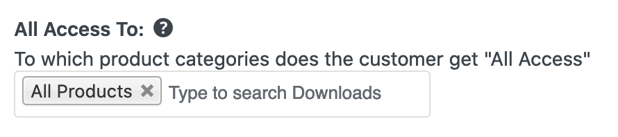 - All Access To: This allows you to set which products the customer can download if they purchase this All Access Pass. By leaving it blank, they will have access to all products in your store. If you choose a specific category, the customer will only have access to that category.