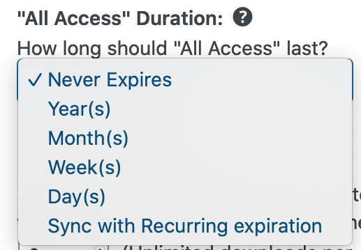 - All Access Duration: This option determines how long the customer will be able to download products after purchasing this All Access Pass before it expires.