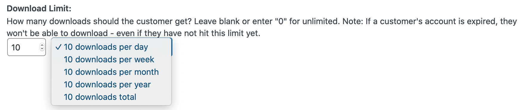 - Download Limit: This option determines how many downloads the customer can use. By default, it is set to unlimited – which is how it works if you set the limit to 0. Once the customer uses the number of downloads you set here, they can no longer download any more products. For example, you may want to limit your customers to have 10 downloads per day/week/month/year/total.