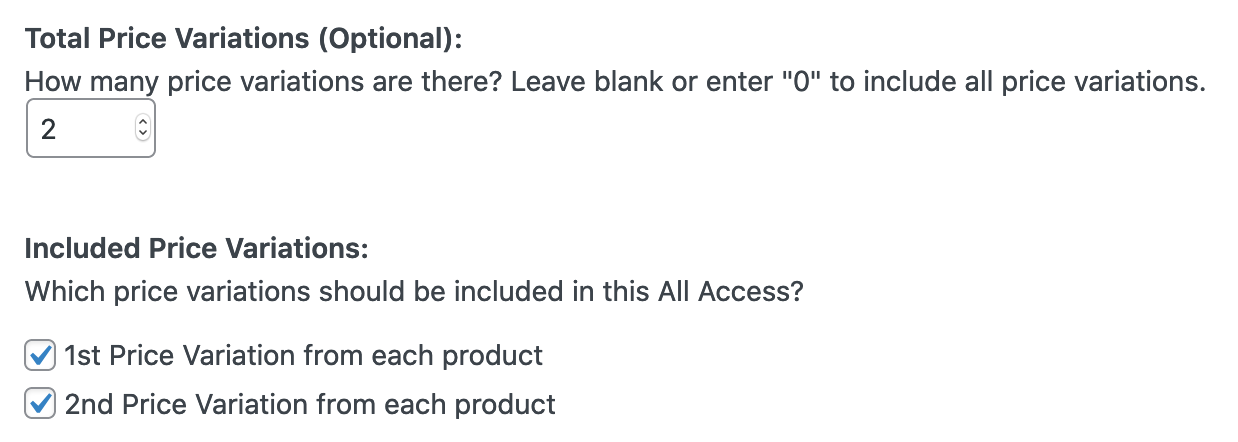 Note: This requires your products to all have the same price variations set up. Also, If you do not check any of the price variation checkboxes, All Access customers will have no access to any product variations. However, products without variable pricing (single price mode) will still be accessible.