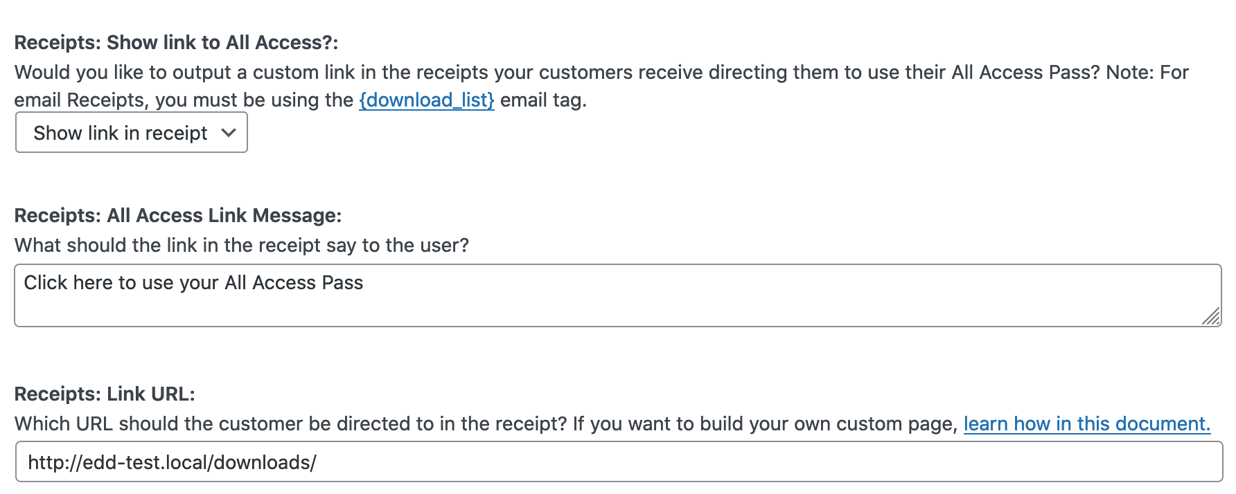 - Show link to All Access?: This is where you can enable or disable the All Access link in the purchase receipt.