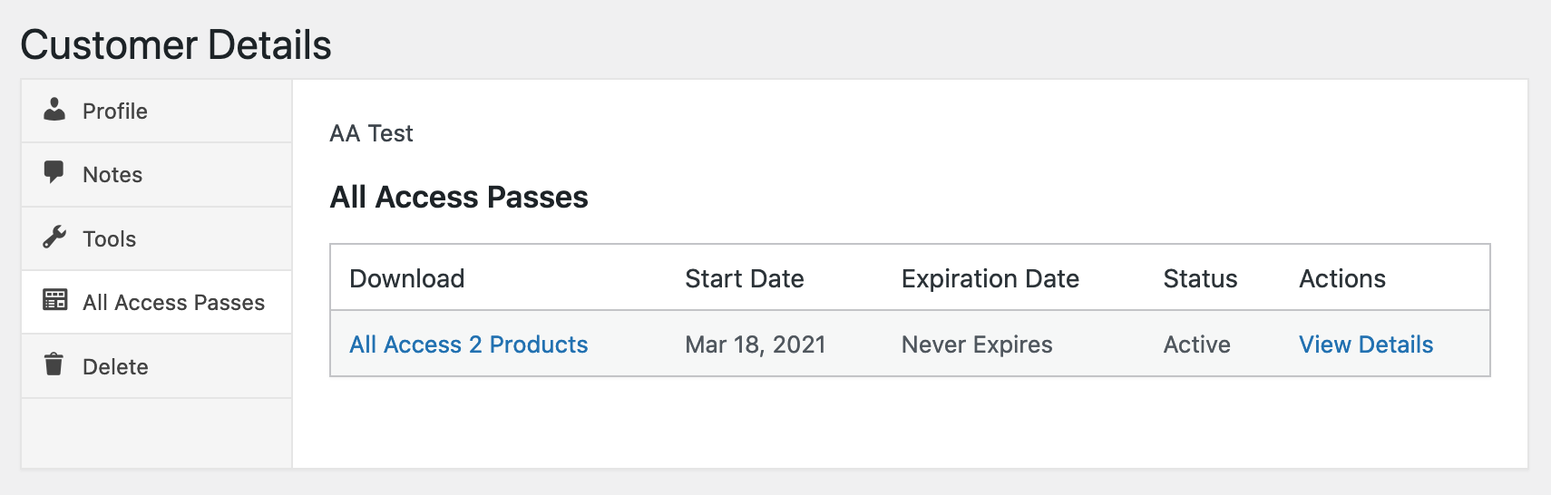 You can verify existing customers, who purchased the bundle, now have an All Access Pass by going to Customer Details, then selecting All Access Passes.