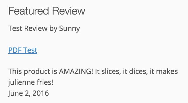 The output includes the widget title, review title, reviewer name, product title, review full text, and the date of the review.