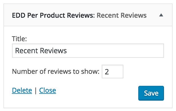 This widget renders recent reviews. You may provide a number to limit how many reviews display. Admin screenshot: