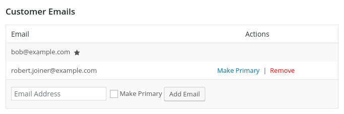 Each customer can have multiple email addresses, allowing them to purchase from more than one address, or purchase from one and get support from another. Each customer will also have a primary email address, which gets used as a default for the customer. In the Customer Management tab the UI looks like this: