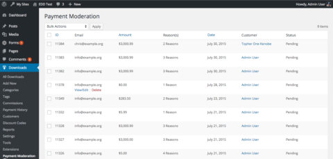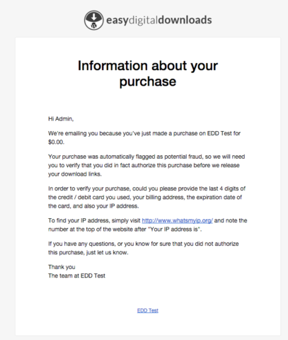 When a purchase is flagged as possibly fraudulent, an email can be delivered automatically to the site admin and/or to the customer in order to request additional information necessary for verifying the purchase. Once the purchase is reviewed by a site manager, the receipt and download links can be released to the customer. If the purchase is confirmed to be fraudulent, Fraud Monitor allows you to easily reverse the payment, preventing costly chargebacks or fraud penalties in the future.