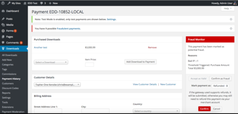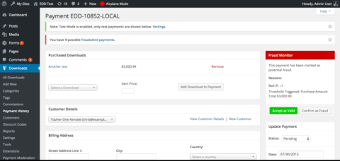 Fraud Monitor is an extension that adds robust monitoring to your Easy Digital Downloads store and works for you to automatically detect possibly fraudulent purchases, allowing you to rest easy and focus on growing your business instead of fighting fraud.