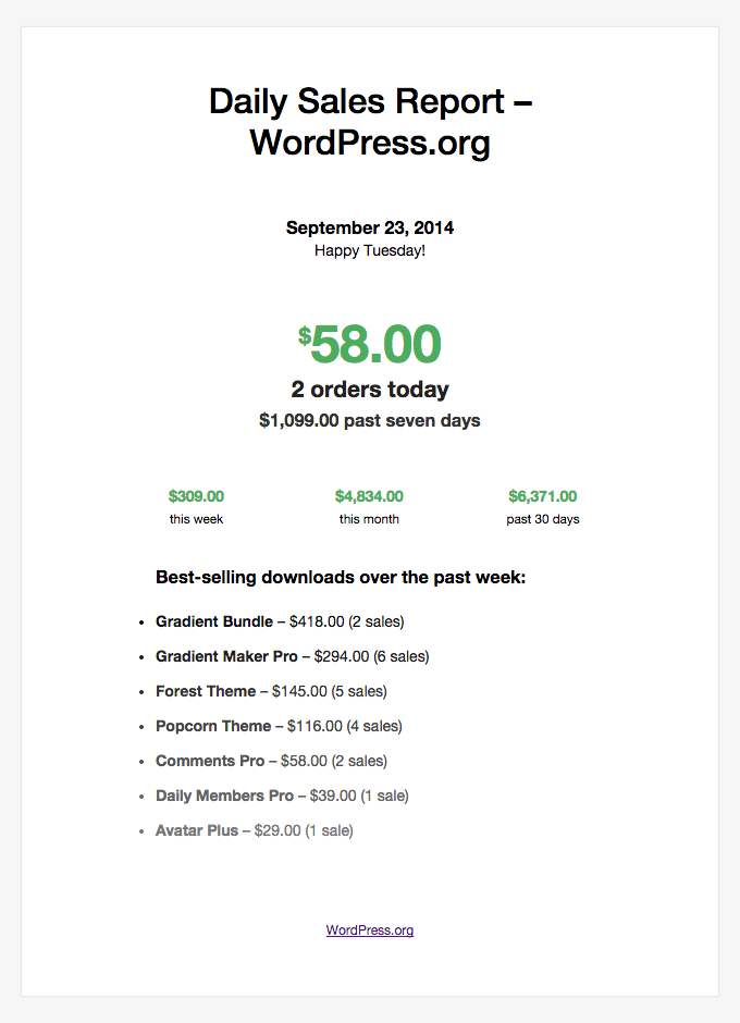 EDD Email Reports solves this conundrum by fetching all of your store’s important statistics and packing them into a detailed sales report email that summarizes how your products are selling for the current day, week, month, and rolling 7 and 30 day intervals.