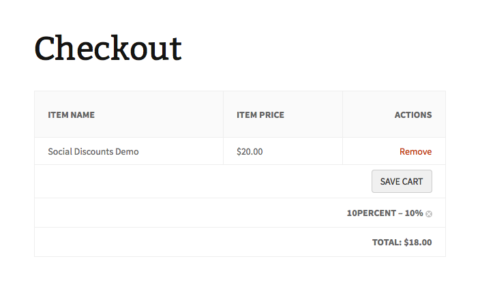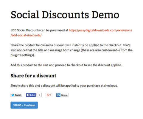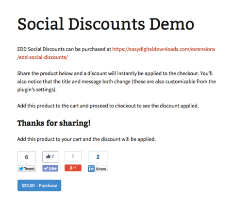 Ever wanted to offer your customers a discount for sharing or liking products on your website? This plugin does exactly that. It also allows you to share standard posts and pages, and products from a completely different post/page on your website. By turning off the discount functionality altogether, you can also use it as a simple sharing tool.