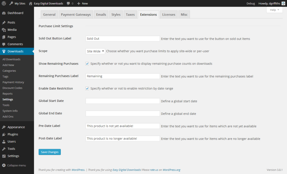 Purchase Limits also allows you to limit the dates Downloads are available to be purchased by setting a start and/or end date.