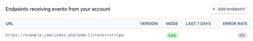 Webhooks are automatically configured when connecting a new EDD store to your Stripe account.