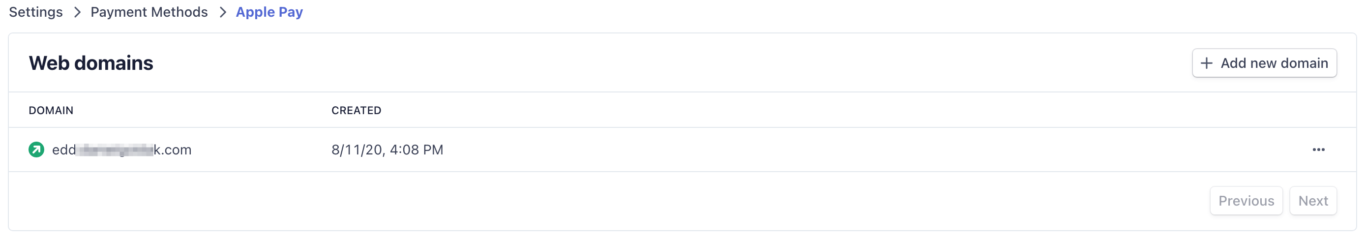 To use Apple Pay, you need to register with Apple all of your web domains that will show an Apple Pay button. Go to the Apple Pay tab in the Account Settings of your Stripe Dashboard.
