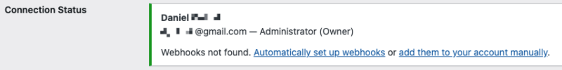 – Webhooks may not be created automatically on local / staging sites or in test mode. You’ll see an option to test webhook creation, which will configure webhooks when clicked.