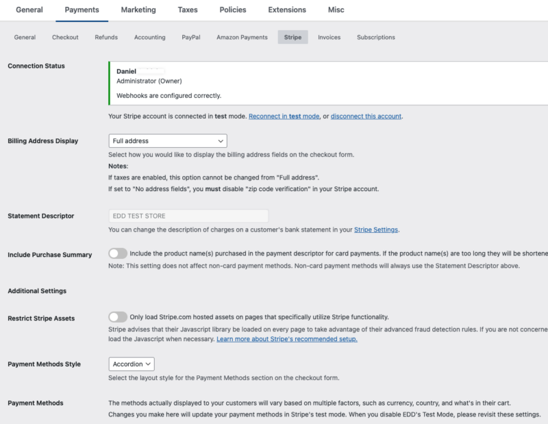 Changes you make here will update your payment methods in Stripe’s test mode. When you disable EDD’s Test Mode, please revisit these settings.