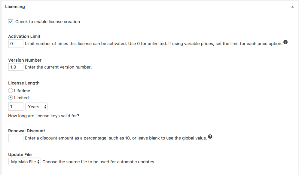 Software Licensing has been built specifically with WordPress theme and plugin developers in mind, but can be used for any kind of software licensing through the included API. Included with the add-on are complete samples that illustrate how to implement license activation and checking in your theme or plugin, and how to setup automatic upgrades for your theme or plugin that are delivered through the licensing system.
