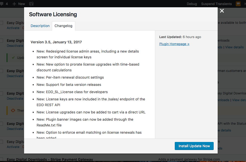 Software Licensing includes full support for parsing the readme.txt files for WordPress plugins, allowing you to include the same information in plugin update dialogs as plugins hosted on WordPress.org.