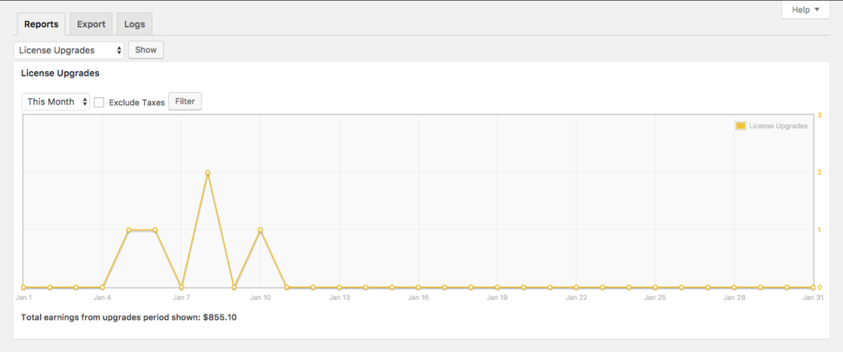 Software Licensing also provides a complete reporting view that displays a graph of license renewals and earnings from those renewals over time so you can better understand how many customers renew their licenses.