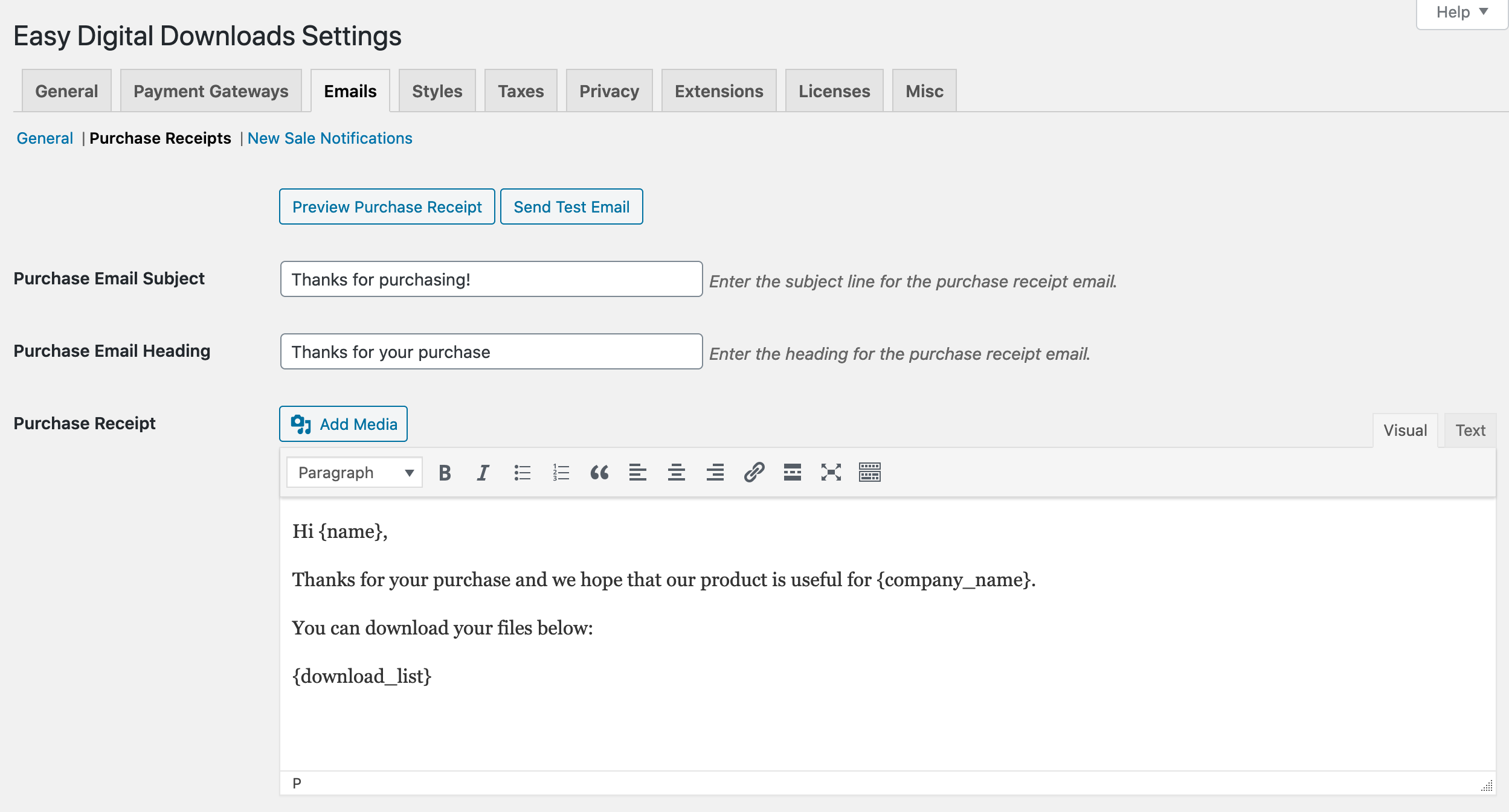For example, if you have a field called “Company Name” that has a meta_key of “company_name”, you will use {company_name} as the template tag in the emails.