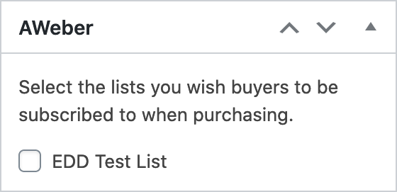 When editing a specific Download there will be a meta box in the right column labeled AWeber. It will show all the email lists available on AWeber, and the site owner may pick one to be attached to this Download, and override the global setting.