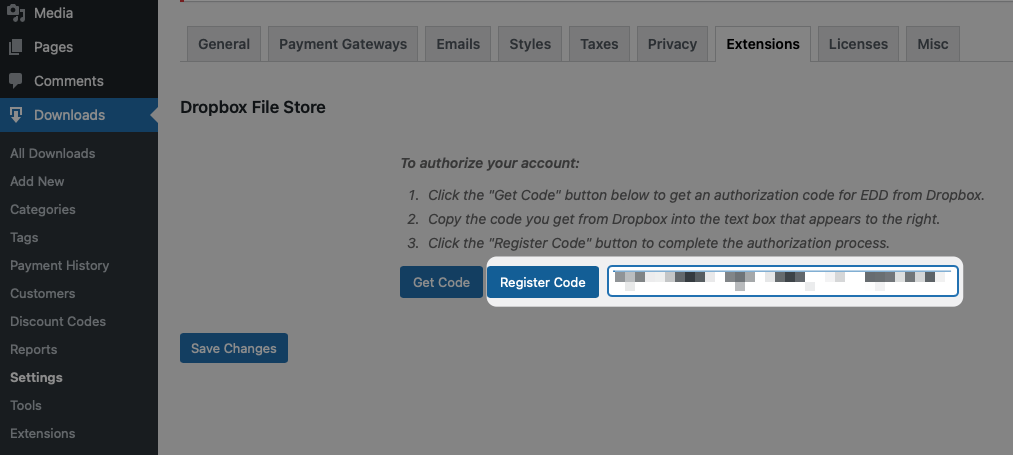 EDD Dropbox File Store extension allows you to store download files in your Dropbox account. Once installed and activated, you will need to authorize the EDD Dropbox File Store app to access your Dropbox account on the Downloads → Settings → Extensions page in your WordPress dashboard. To start, click the Get Code button.