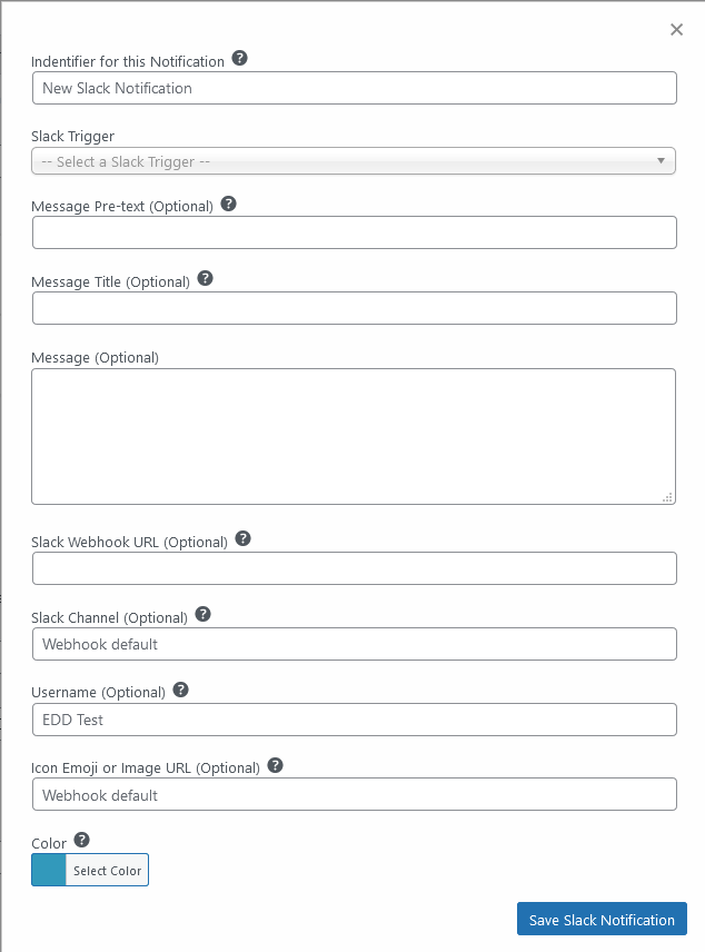 Slack Trigger: Defines the Trigger which results in this notification sending a message to Slack. This can be an action within Easy Digital Downloads or another supported Easy Digital Downloads Extension. Based on the choice of Trigger, additional fields will be added to the Form and different Text Replacements for the Message Pre-text, Message Title, and Message fields will become available so that pertinent information about the Notification can be passed to Slack.