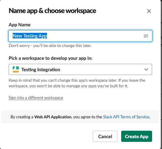 The App Name field can be anything you want. It is used within Slash Commands as the “Username” when it returns data back to you. The Workspace field should be the Team you want to link your EDD store to. Click “Create App” to continue.
