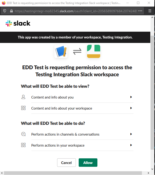 Once you click this button, a similar popup window will appear as when you previously set up Interactive Messages and Slash Commands. This is because you need to grant more permissions to your Slack App.