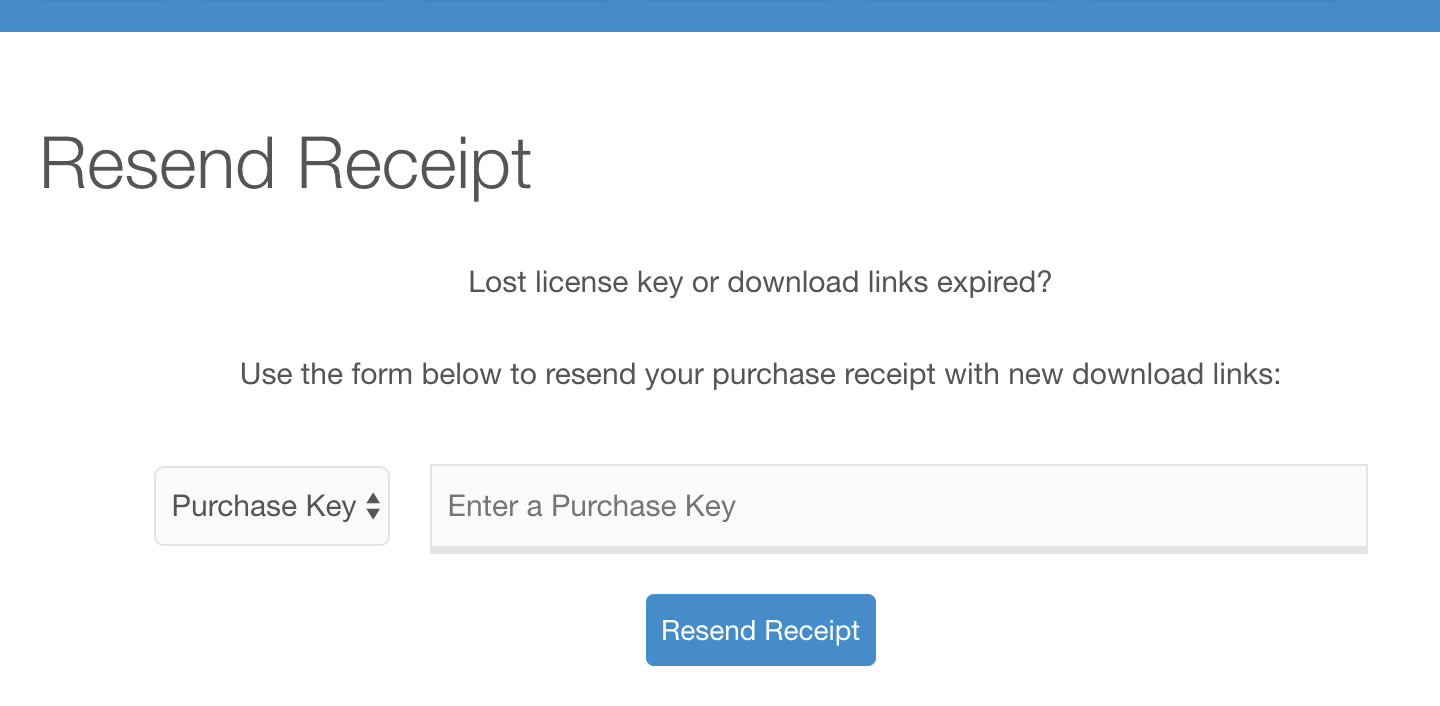 The Resend Receipt extension allows users to resend their receipts by entering the Payment ID, Purchase Key or License Key (if using the Software Licensing extension). This will work for both guest purchases and registered user purchases. If a customer’s download link has expired, this form will also allow them to receive a new download link via email.