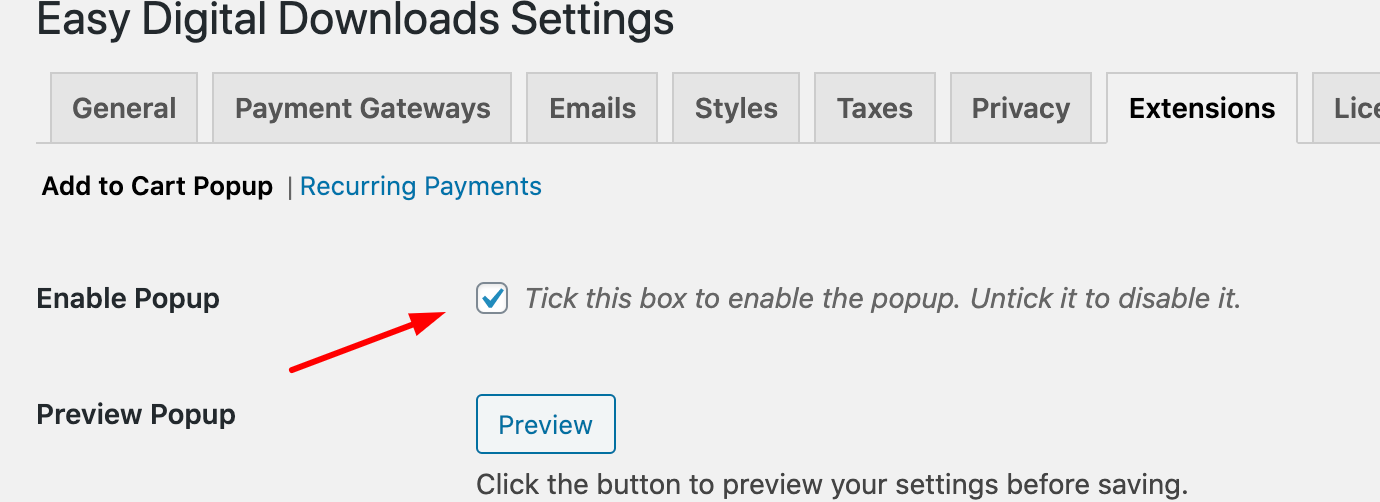 - Once installed, locate the settings for this extension via WordPress admin → Downloads → Settings → Extensions → Add To Cart Popup