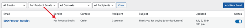 Once you have a custom email configured, you’ll be able to see it in the list of emails under Downloads > Emails. You can use the Senders filter to only display Per Product Emails. You are able to click the email to open the editor or toggle the Status to disable or enable.