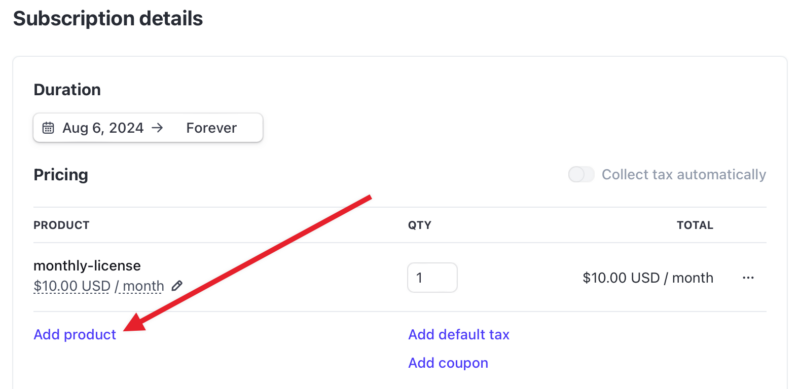 3. Add a product. If you need a unique price, any product will work as the price is what matters, the customer does not see what product is added to this subscription. You can also apply a coupon to lower the price for one payment or indefinitely depending how the coupon is configured.