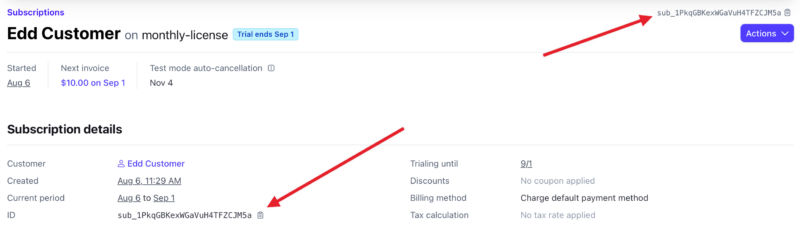6. Open the new subscription in Stripe and copy the Subscription ID. Use that when creating or re-creating the subscription in EDD using the instructions in this documentation.
