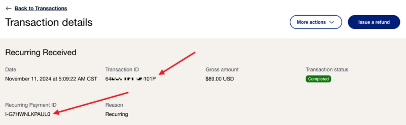 3. The Transaction ID and Recurring or Subscription ID (Profile ID in EDD) will be listed there. Copy and paste them to the EDD Subscription you are creating.