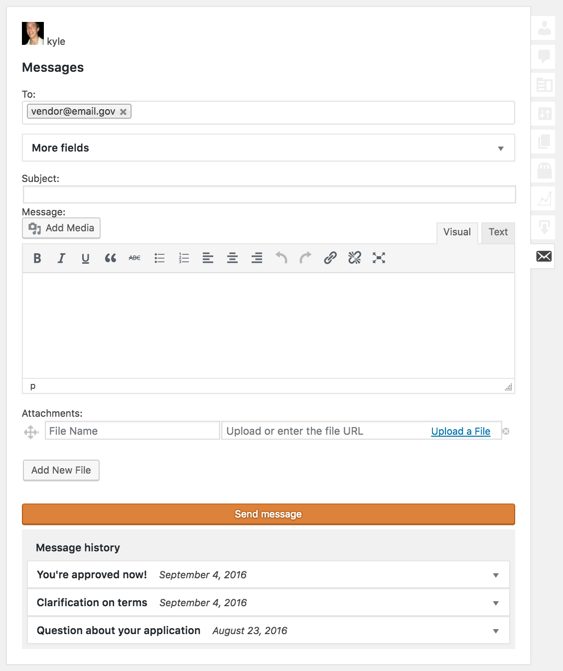 Now, when viewing a vendor in the dashboard, a new view for messaging the vendor directly is included.