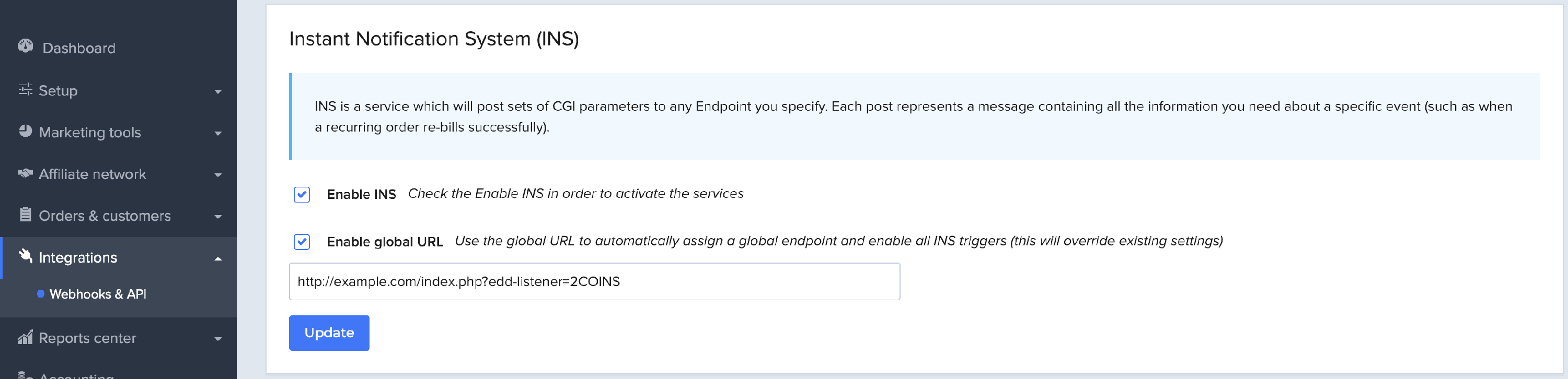 From your 2Checkout account, navigate to the Integrations / Webhooks & API screen and locate the Instant Notification System (INS) section. Enable INS & Global INS and set the URL to: https://example.com/index.php?edd-listener=2COINS