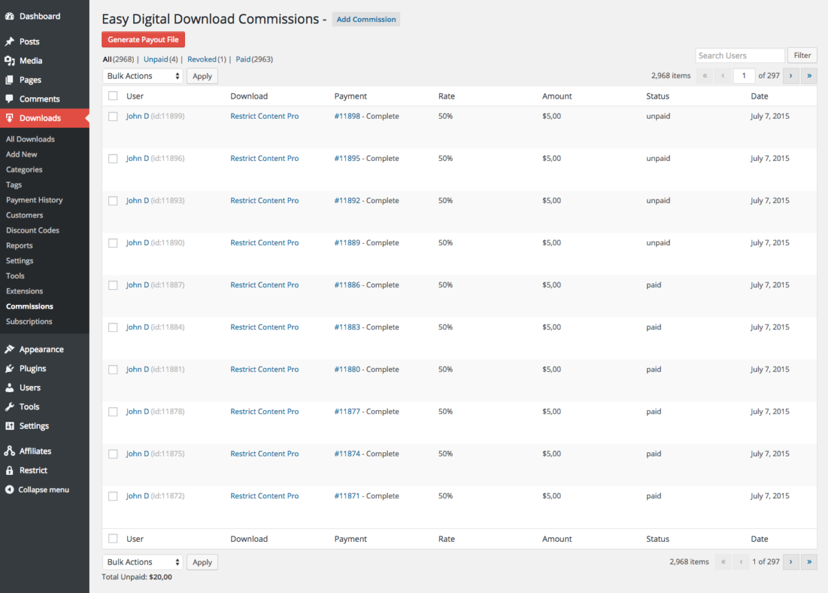 This extension includes the ability to generate a CSV file of all unpaid commissions, or unpaid commissions over a specific date range, that you can then upload to PayPal’s mass payment system, or use to process the commission payouts however you wish.