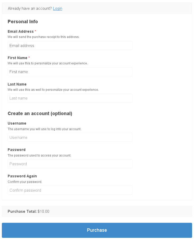 When the above option is set to show both the login for and the registration form then checkout will look like the one below. Note the Login link at the top and the registration form at the bottom.