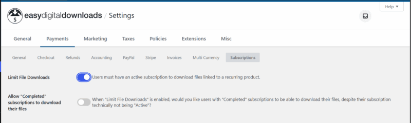 For this setup to work correctly, we need to ensure that customers can only download files included with the bundle so long as they have an active subscription. Once their subscription expires, their file download access will be revoked. To do this, go to Downloads → Settings → Extensions → Recurring Payment and check the box for “Limit File Downloads“: