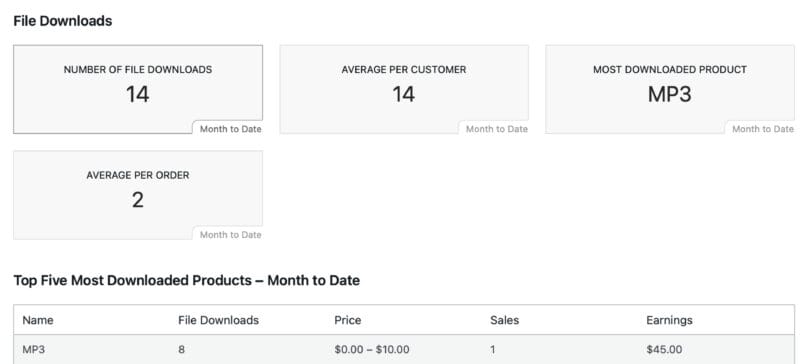 The File Downloads report provides details about files downloaded as a result of purchases made via your store. Available data includes Total File Downloads, top five most downloaded products and a graph of sales over the set period of time.